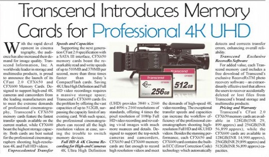 Headline : Transcend Introduces Memory Cards for professional 4K UHD