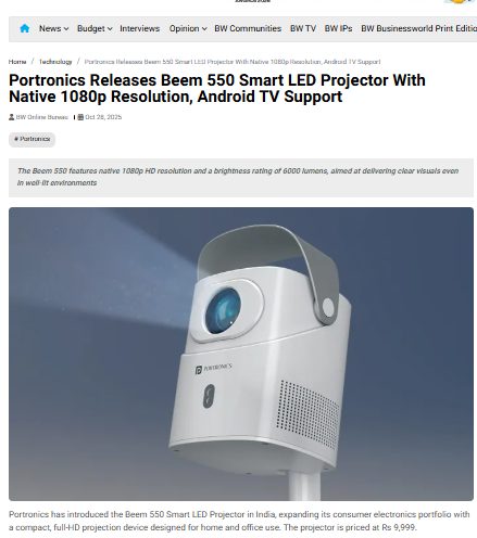 Headline : Portronics Releases Beem 550 Smart LED Projector With Native 1080p Resolution, Android TV Support