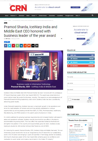 Headline : Pramod Sharda, IceWarp India and Middle East CEO honored with business leader of the year award