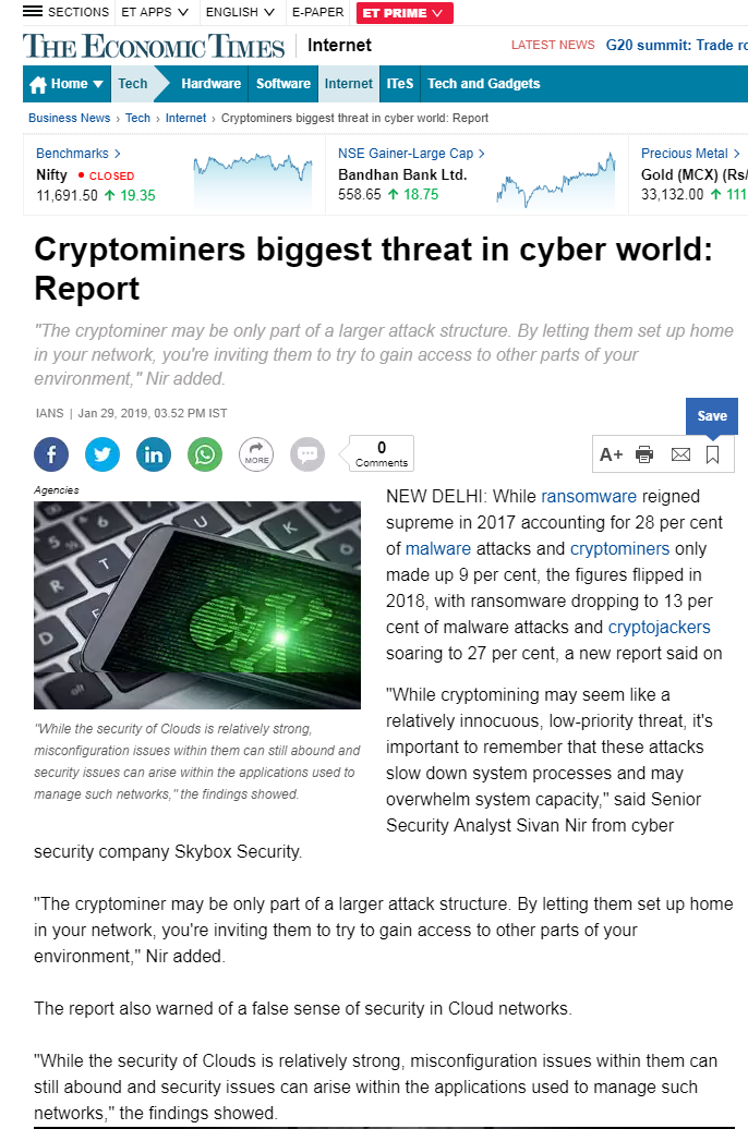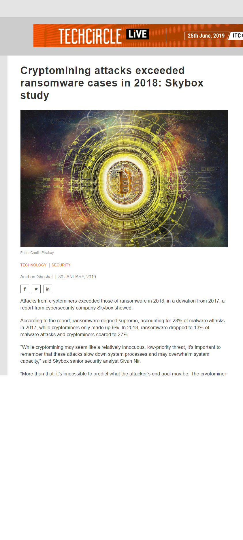 Headline : Cryptomining attacks exceeded ransomware cases in 2018: Skybox study