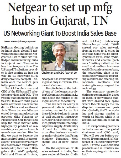 Headline : NETGEAR to set up manufacturing hubs in Gujrat, TN